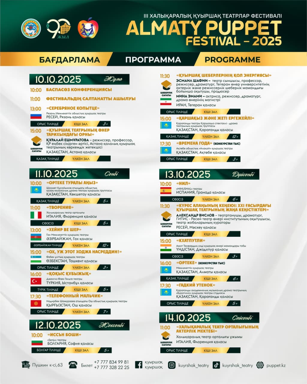 10-14 қазан аралығында Республика күніне орай Мемлекеттік қуыршақ театры III Халықаралық «Almaty Puppet Festival» қуыршақ театрлары фестивалін өтеді. Алматы қаласы Мәдениет басқармасының қолдауымен өткелі отырған фестивальге әлем елдерінен үздік театрлар қатысады.